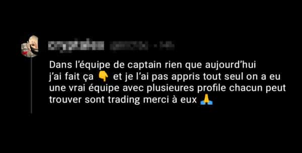 Nos analyses techniques et formations sont reconnues et appréciées par les traders professionnels de la communauté ! Elles sont neutres et destinées à vous permettre d’apprendre en vous faisant votre propre opinion rapidement. Le Captain est avant tout un guide ! Il vous apprendra à définir vos propres signaux tout en vous exposant ses réussites afin que vous puissiez recouper différentes sources et ainsi définir les trades les plus sécurisés.